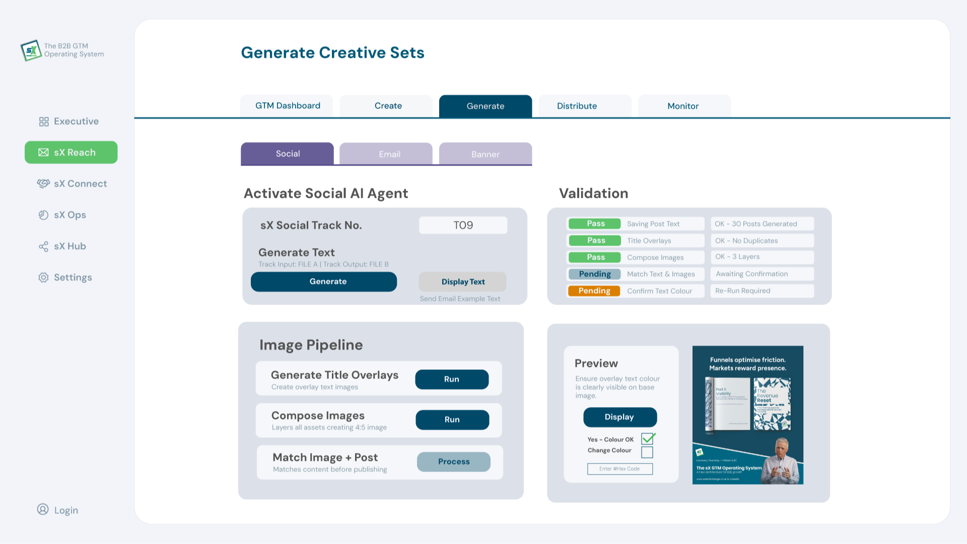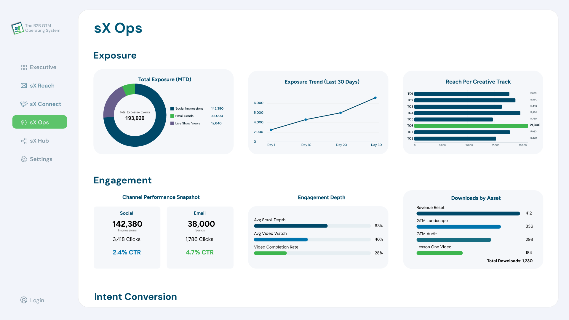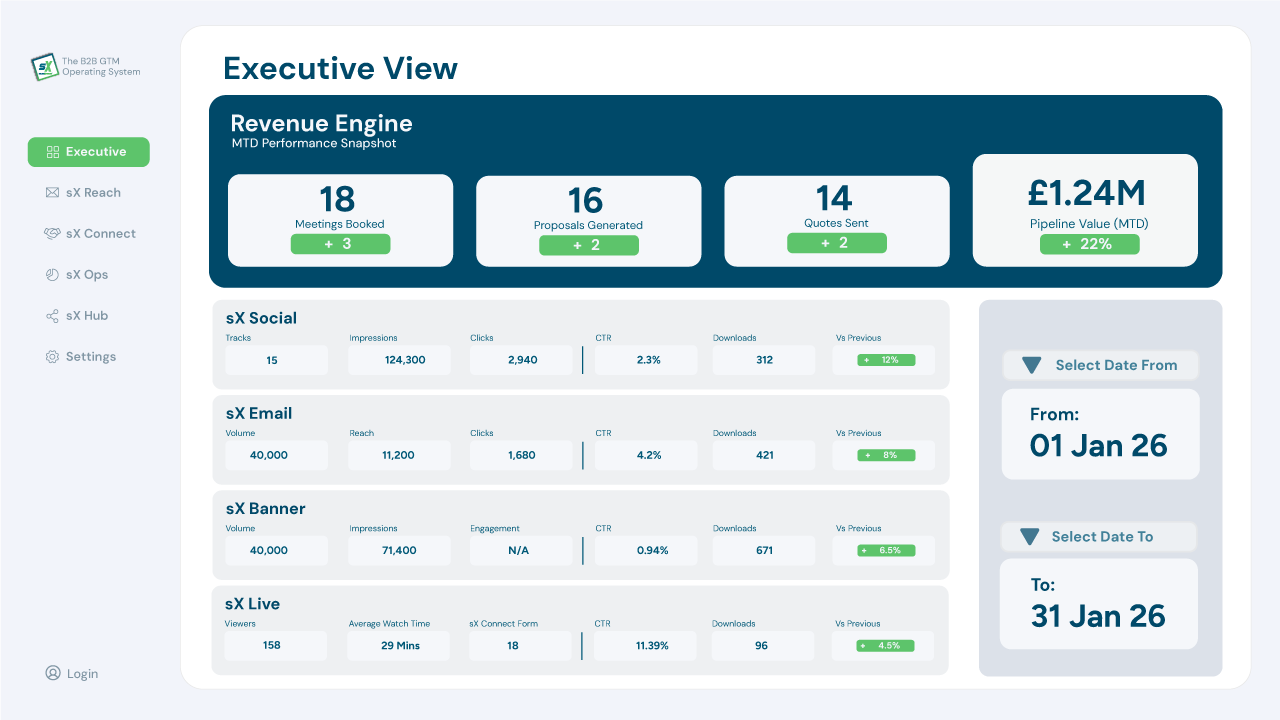 Once your team understands the model, this is where they operate. sX OS is the structured environment that turns B2B GTM transformation into repeatable execution. It connects market reach, authority building, broadcast content, conversion workflows, operational management, and telemetry. The Academy teaches the thinking. sX OS provides the structure to run it.