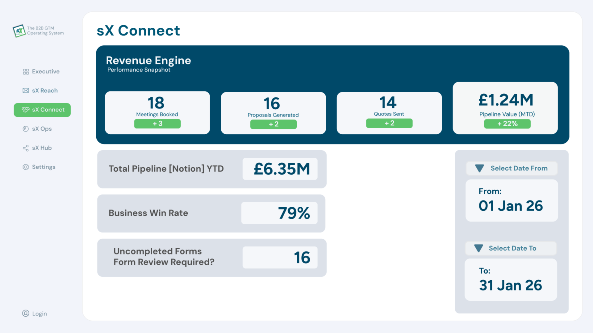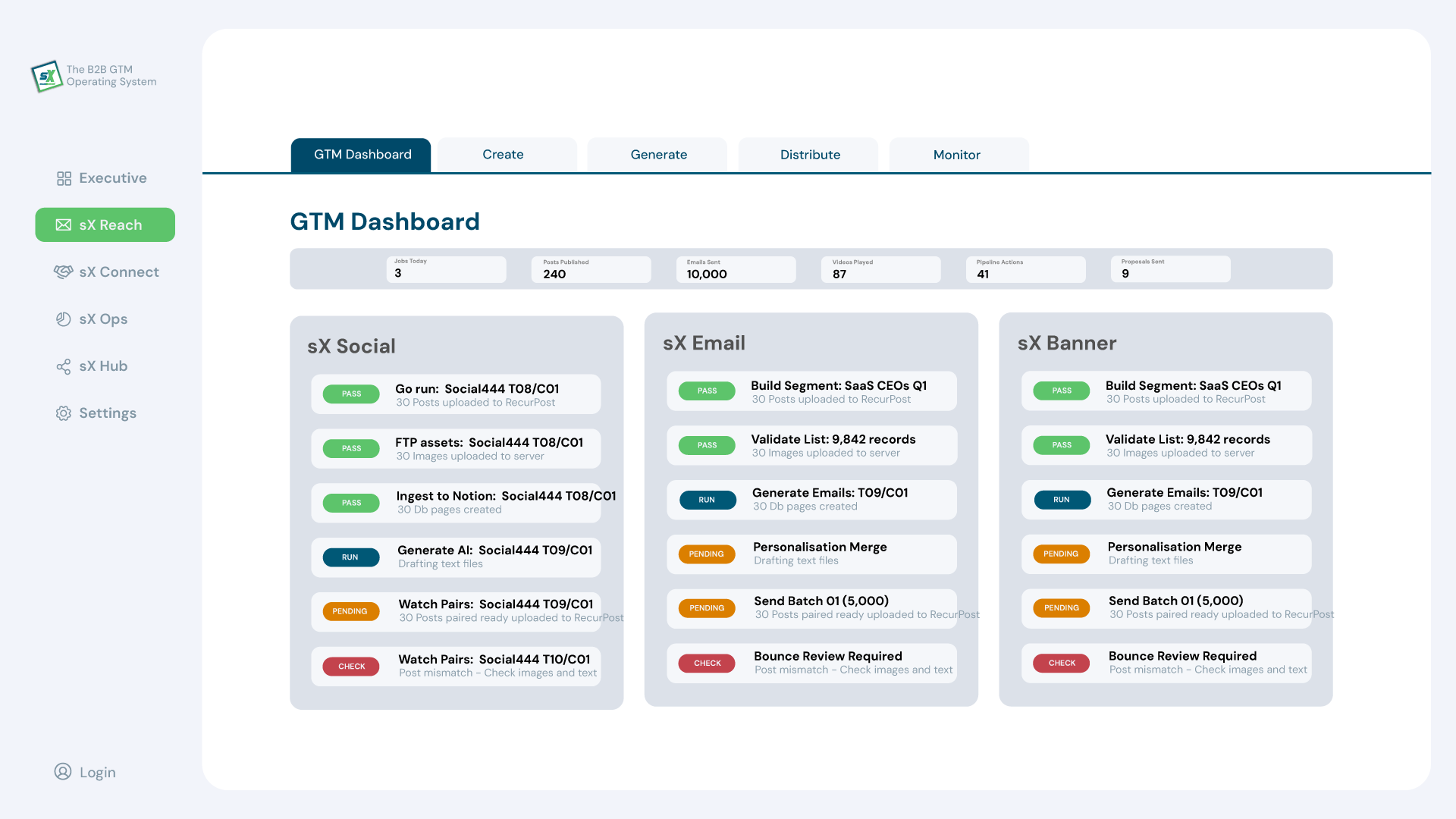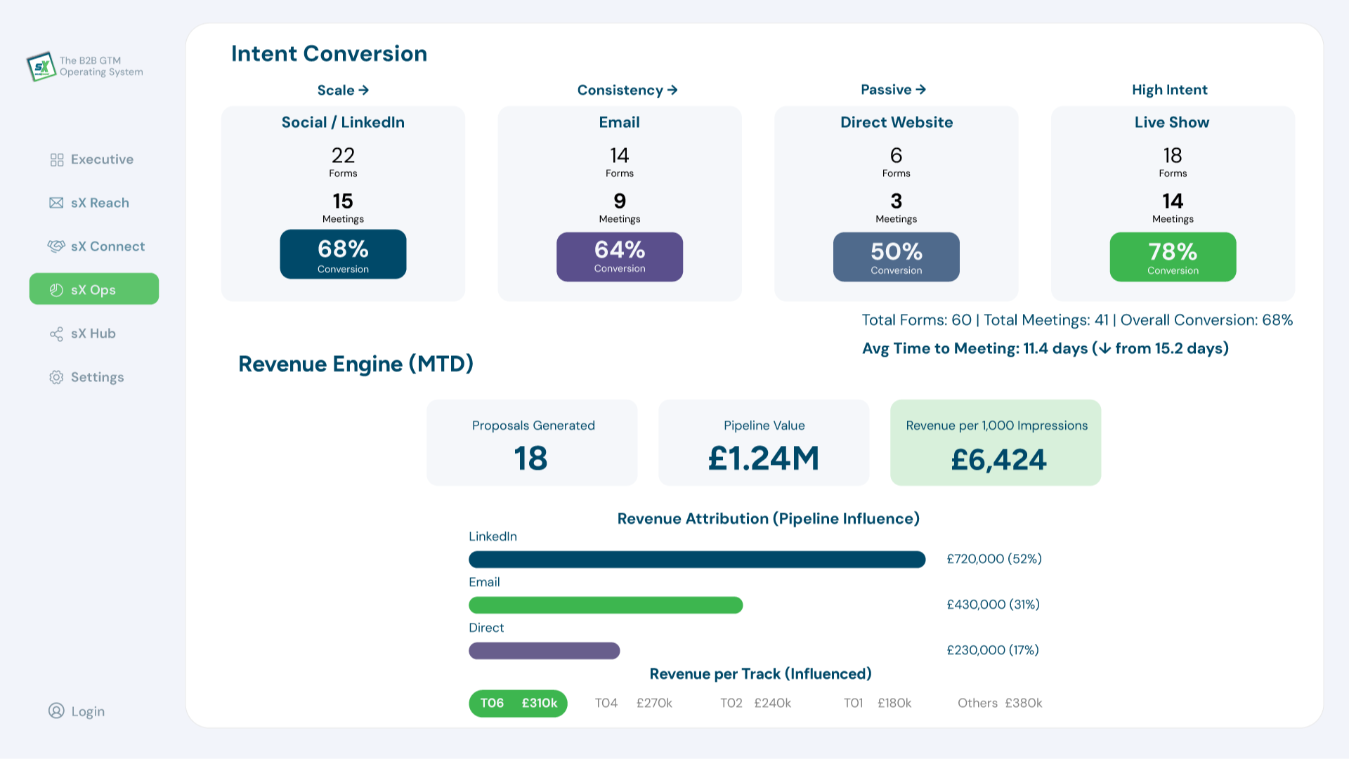 Once your team understands the model, this is where they operate. sX OS is the structured environment that turns B2B GTM transformation into repeatable execution. It connects market reach, authority building, broadcast content, conversion workflows, operational management, and telemetry. The Academy teaches the thinking. sX OS provides the structure to run it.